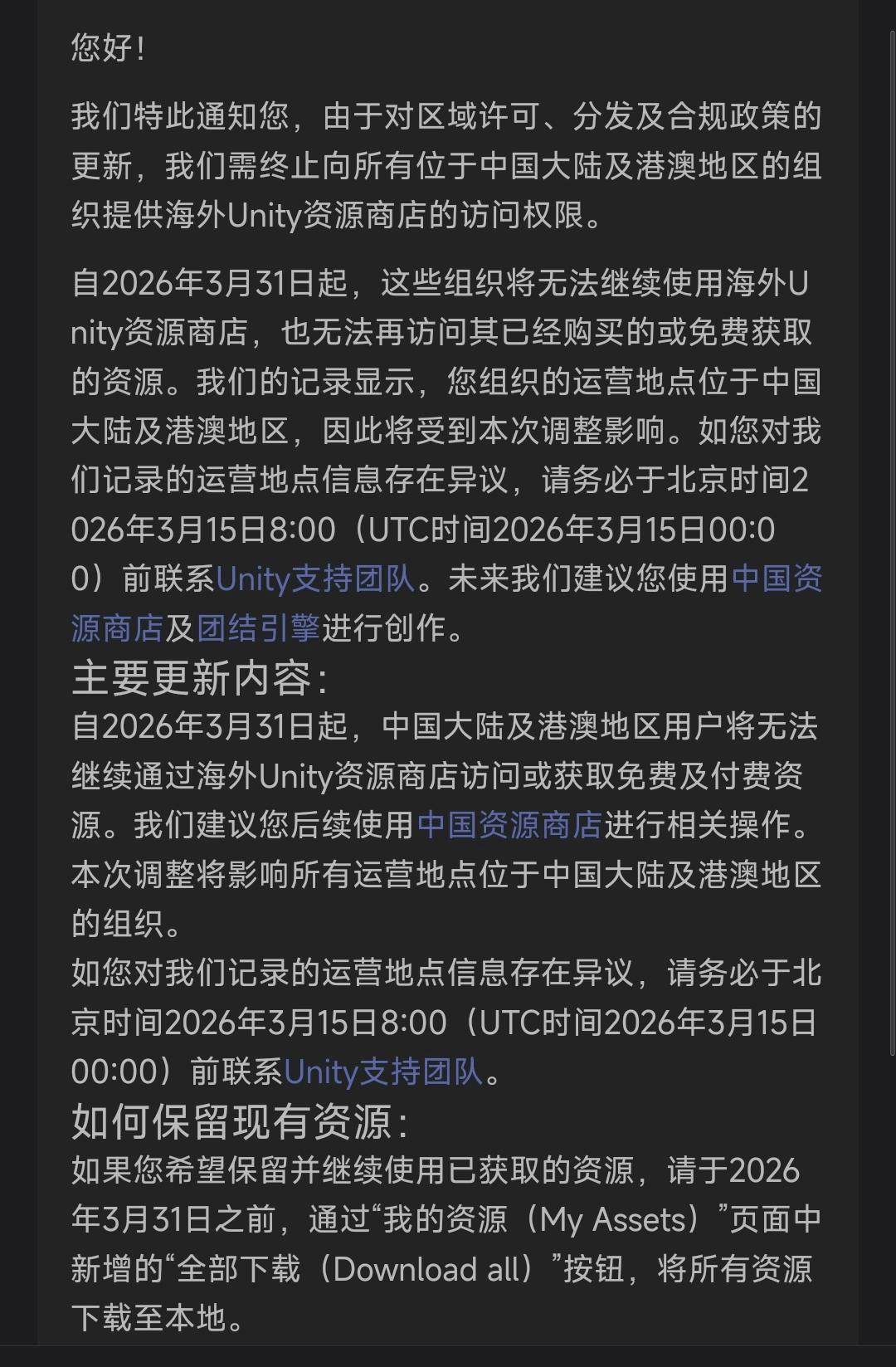 此前Unity中国正在2023年8月推出了国内市场定制的连合引擎。此次停服,